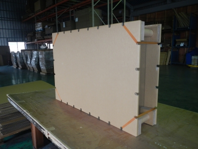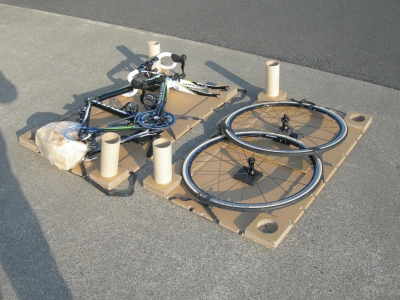 このようになります。固定版にあるキリカキにゴムバンドを使ってそれぞれバイクやホイールを固定します。写真では固定版の上に乗っている状態ですが、2枚の固定版を立てて重ね合わせると、フレームとホイールは天地左右どこにも接していない状態=宙づり状態となります。バイクのどこにもストレスが掛からないもっとも安定した輸送スタイルとなります。紙管と強化ダンボールの効果で圧縮強度も1t以上(理論値)あります。