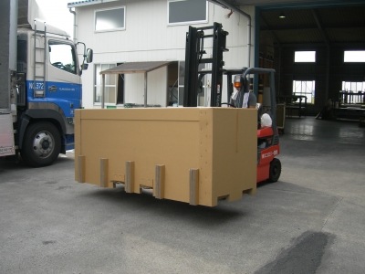 写真は重さ1t超の巻物(フィルム)を輸出するための梱包箱です。ダンボールでそんなものが運べるの?ってお思いになるかもしれませんが、全く問題なく運ぶことができます。しかも驚くなかれ、箱の中では巻物が宙に浮いて固定されているんです。ここでポイントになるのが「宙に浮く」ということです。製品を遠くまで安全に運ぶための最も理想的な形は「宙づり」という形状です。そこで私たちが考えたのが、箱の中で自転車を「宙づり状態で運ぶ」という発想でした。