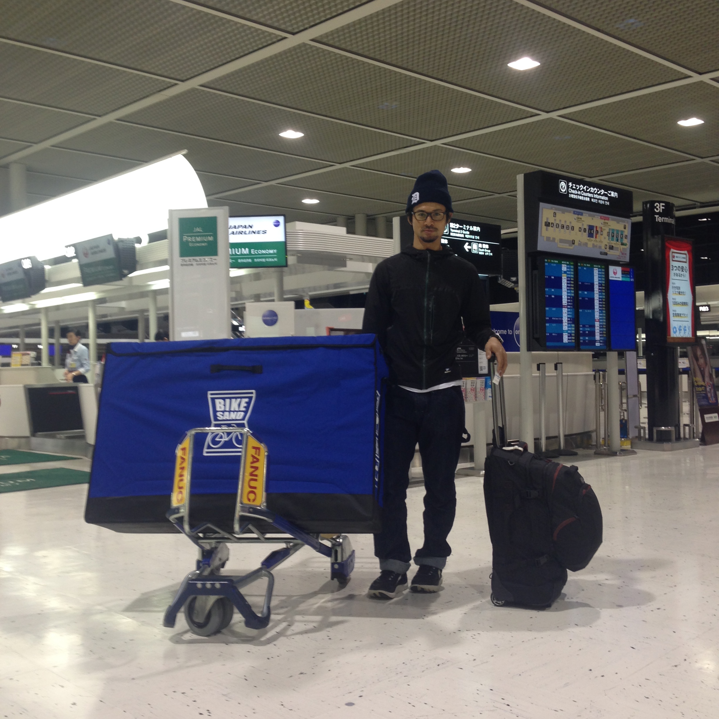 バイクサンドをABC宅配で、自宅から成田空港まで配送。3240円でした(2015年11月現在)その後、ウエットスーツ、ランニングシューズ、バイクジャージ(orトライウエア)と普段着、身支度品、一眼レフカメラなどを入れたソフトタイプのスーツケースだけを持って、成田空港の第二ターミナルのABC宅配カウンターで受け取り、格安航空会社のカウンターがある第三ターミナルまで800mほど歩きました。