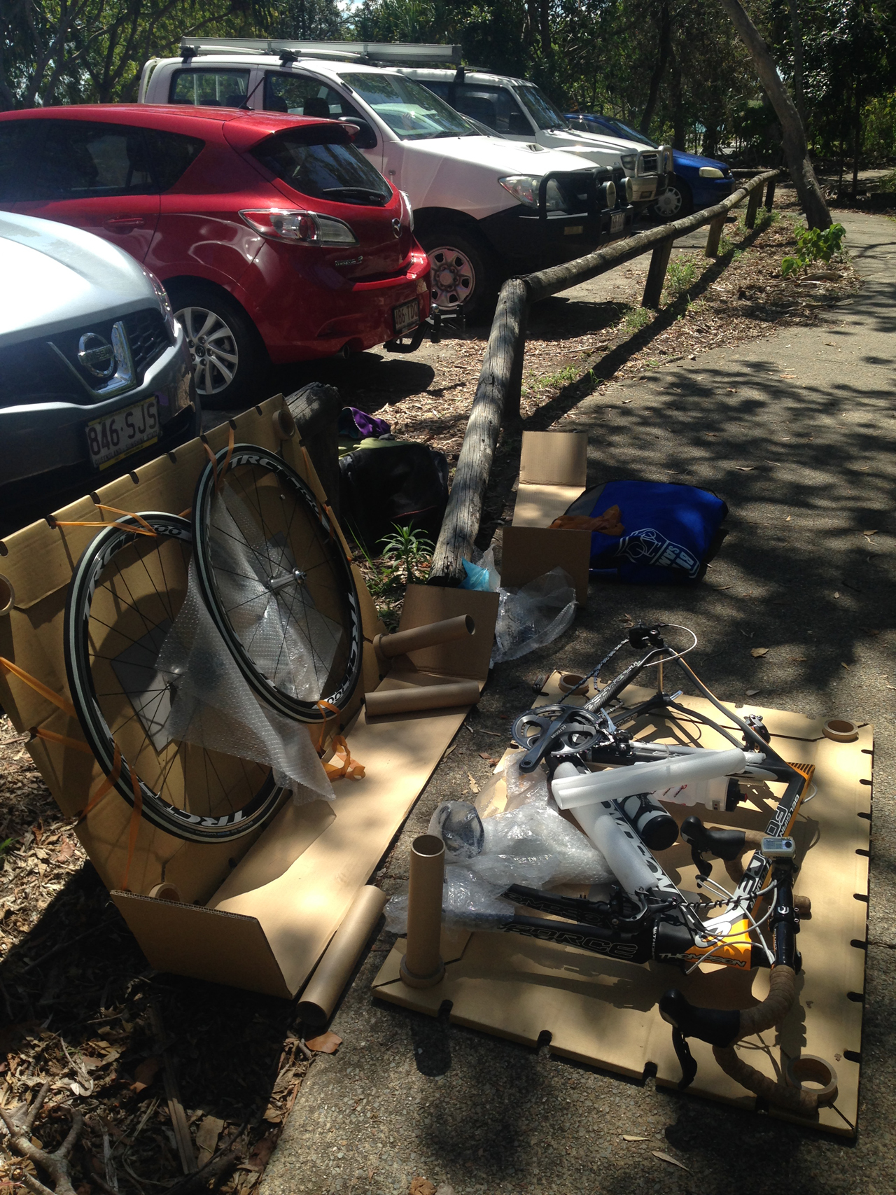 すると、ビックリです!行きに自宅で梱包した、まったくそのまんま、中で動くこともなく、フレームに傷一つ付いていない状態で、そこにバイクが収まっていました。ホイールもしっかり固定。サドルとシートポストも外さずに、サドルの後ろに付いているボトルケージ2つもそのまま動くことなく。組み上げるのは簡単なので、すぐにバイクを用意し、デポジットまで自走。おかげさまでトライアスロンも無事に完走できました。