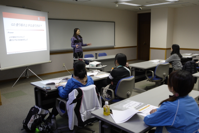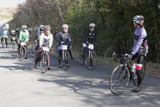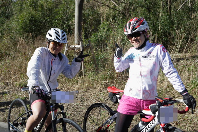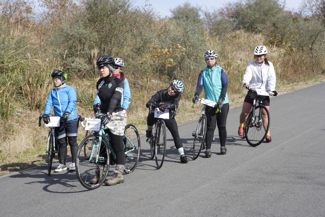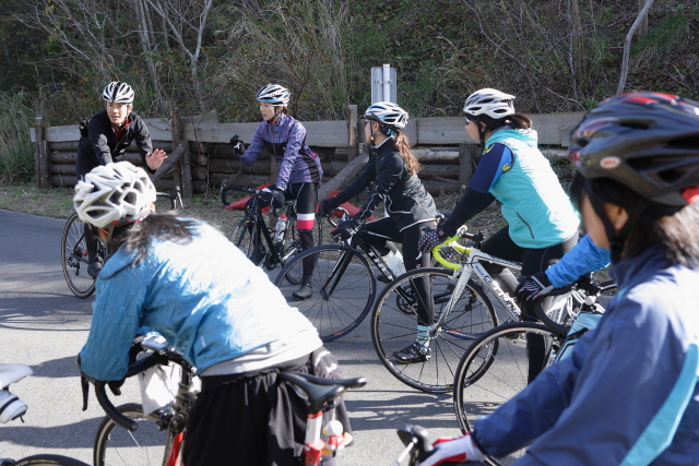 ウォーミングアップで、軽くヒルクライムしたあとは、ポジションチェック&正しいぺダリングの講義です。レポーターは撮影に専念していたため、詳しい解説は割愛させていただきますが、女性トップライダーならではの理論展開で、これからレベルアップを臨む女性には、とても分かりやすかったようです。
