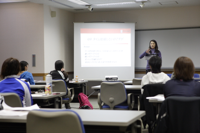 今回のライド教室ですが、参加者の皆さまに予めアンケートをお配りし、苦手な項目、克服したい課題などを聞いておきました。スクール当日、広美選手から参加者の皆さまへ配られた資料は総ページ数が20ページにも及ぶ、膨大なもの。内容は参加者の皆さまの質問をQ&A形式で回答していくものでした。会場ではすべての項目をひとつ一つ丁寧に解説。参加者の皆さまも、自らの疑問がクリアになるとあって、その表情は真剣そのもの。「私人前で話すのは苦手なんです~~」と話していた広美選手も、スクールが進むにつれて、TALKにも熱が帯びてきます。質問も数多く出て、とてもためになる座学となりました。