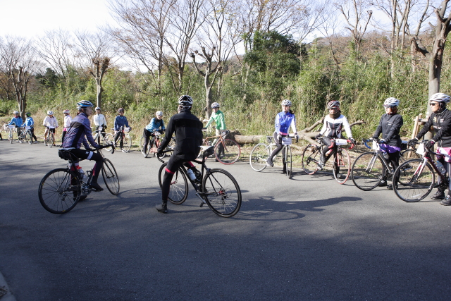 約1時間の講義を聞き終えたあとは、いよいよコースに出て実地練習です。湘南国際村のめぐりの森は、自動車が侵入してこれないので、ヒルクライムなどのロード練習にはもってこい。(雑木林などトレイルへの侵入は禁止されています)練習が始まるまでには皆さん気心も知れ、しばしリラックスムードです。